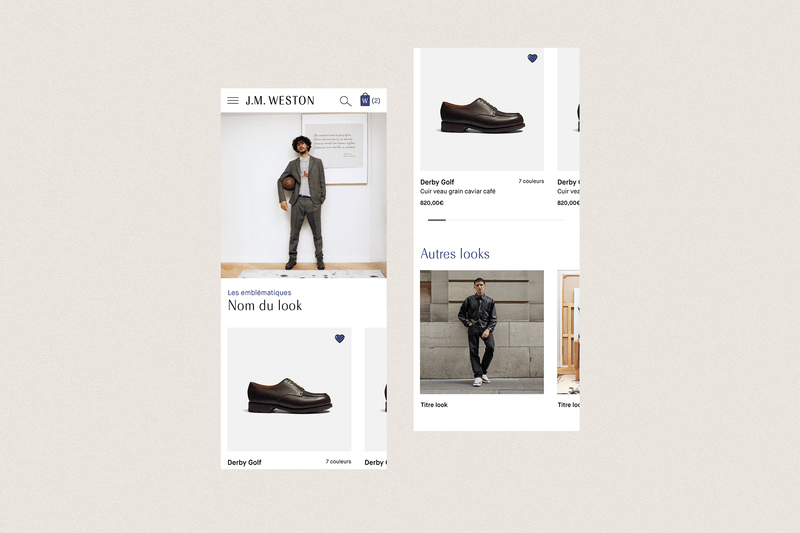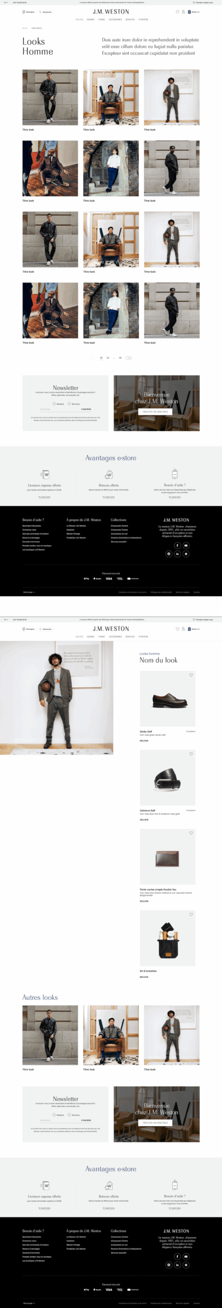Au cours de mon travail pour J.M Weston, j’ai développé des pages looks. Simples et efficaces, ces pages ont pour but de faire découvrir les variations de style de la maison.