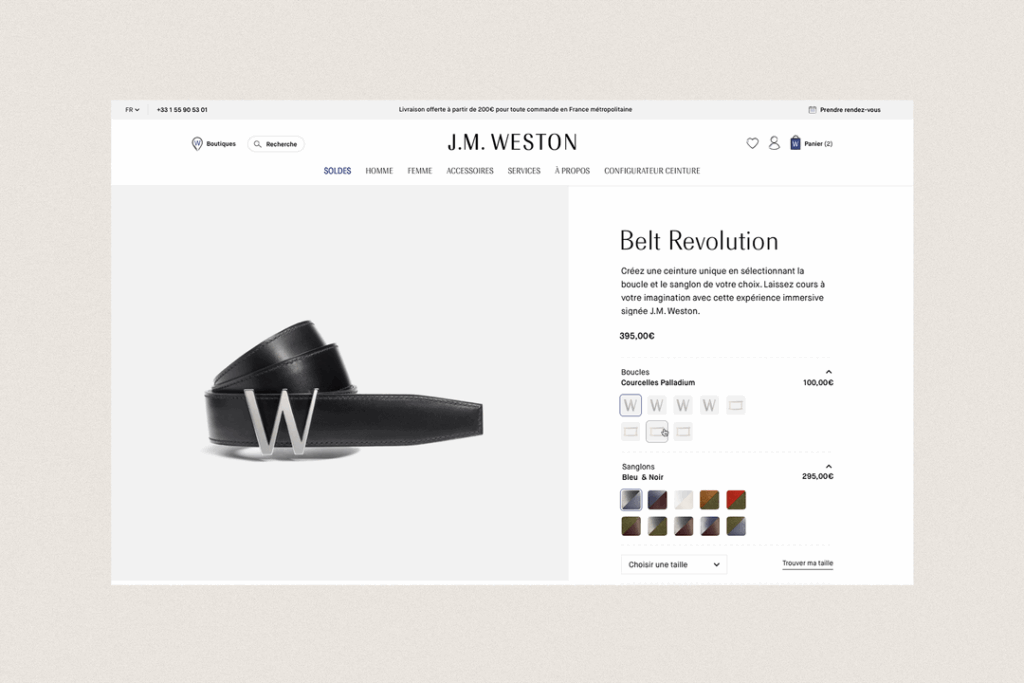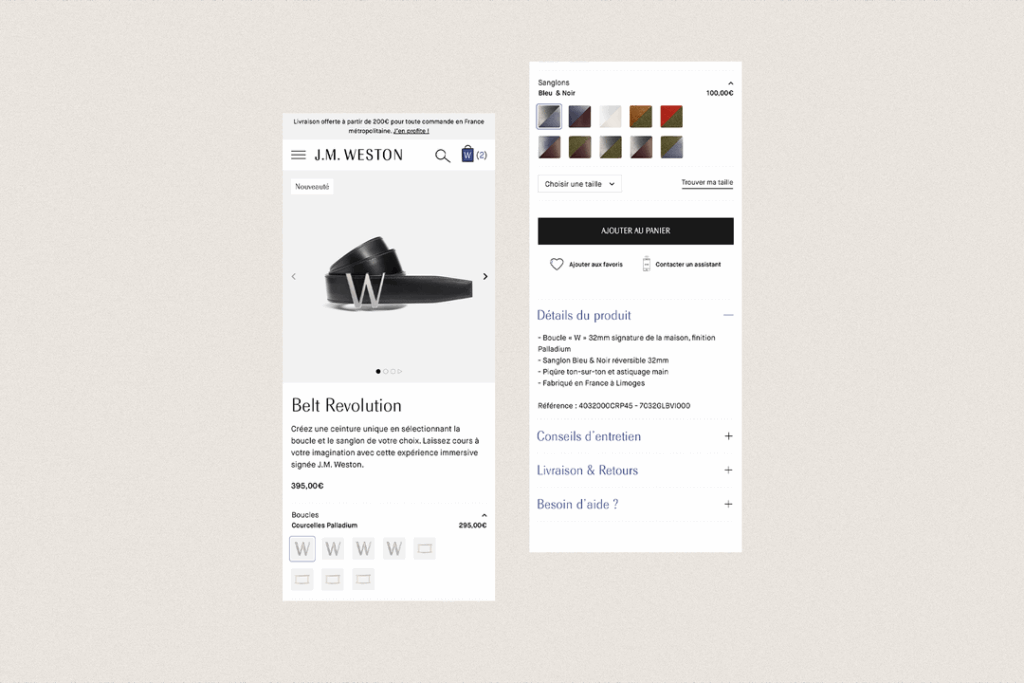 Le module de ceinture personnalisée fonctionne comme une fiche produit afin de faciliter la sélection des éléments et l’ajout au panier tout en montrant les détails de chaque variante.