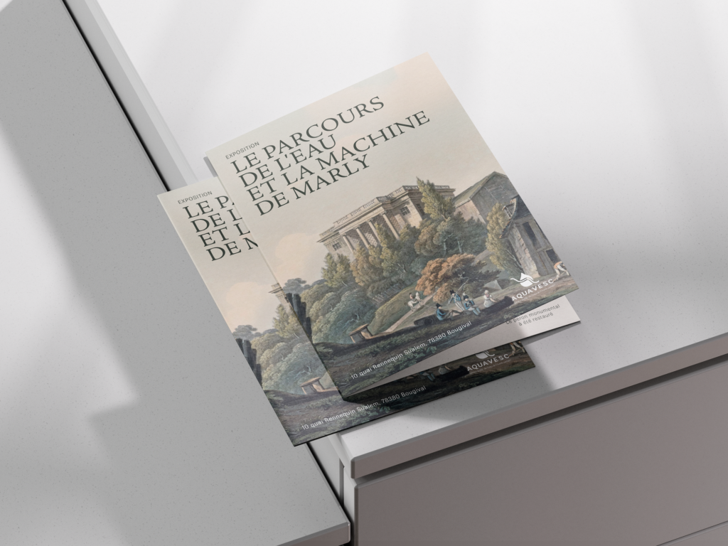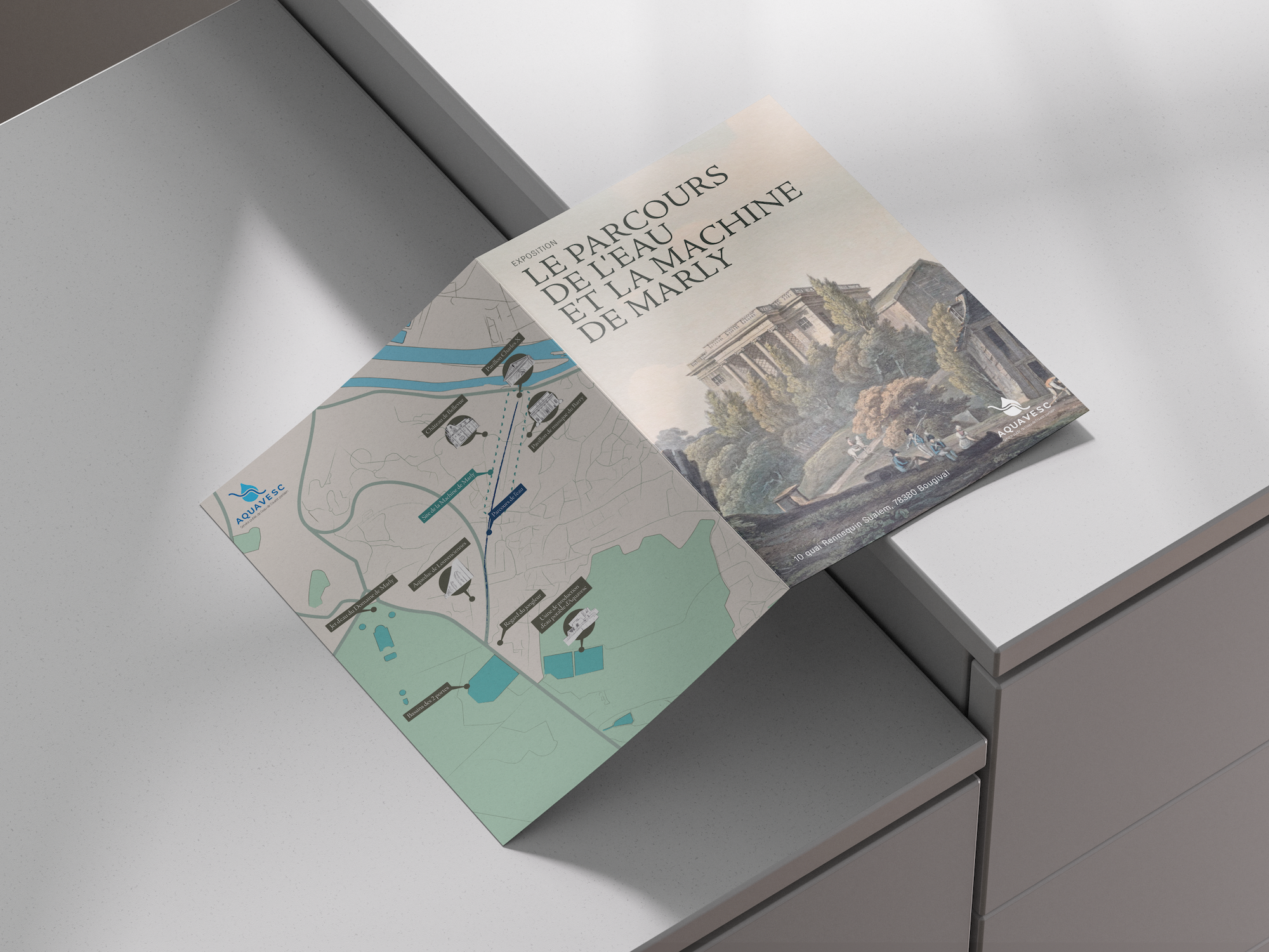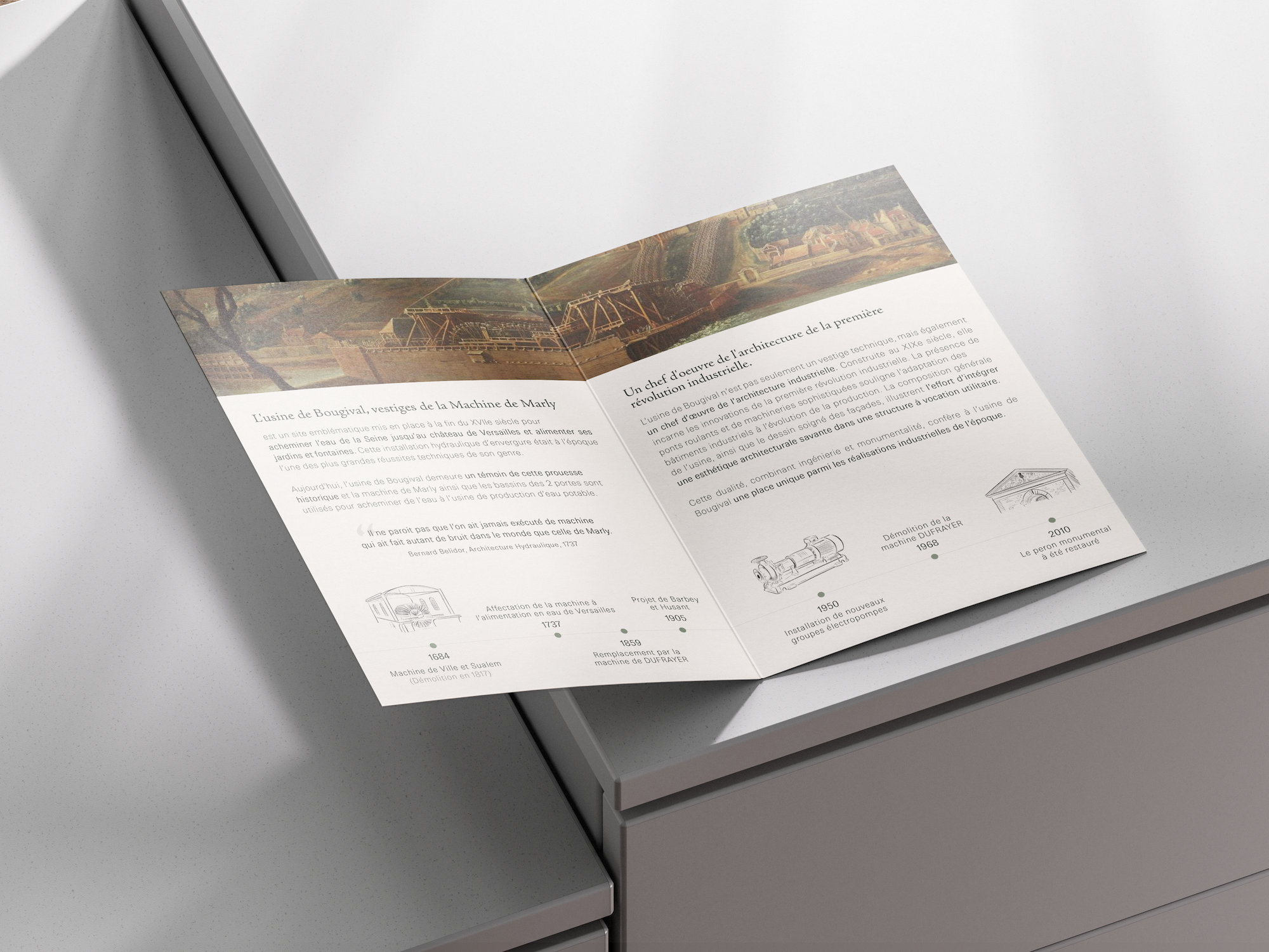 Dans le but de partager aux visiteurs du contenu autour de la Machine de Marly j’ai créé un flyer. Les intéressés découvrent à travers cette brochure une brève histoire de la Machine mais aussi le parcours de l’eau qui en découle et le programme de la visite.
